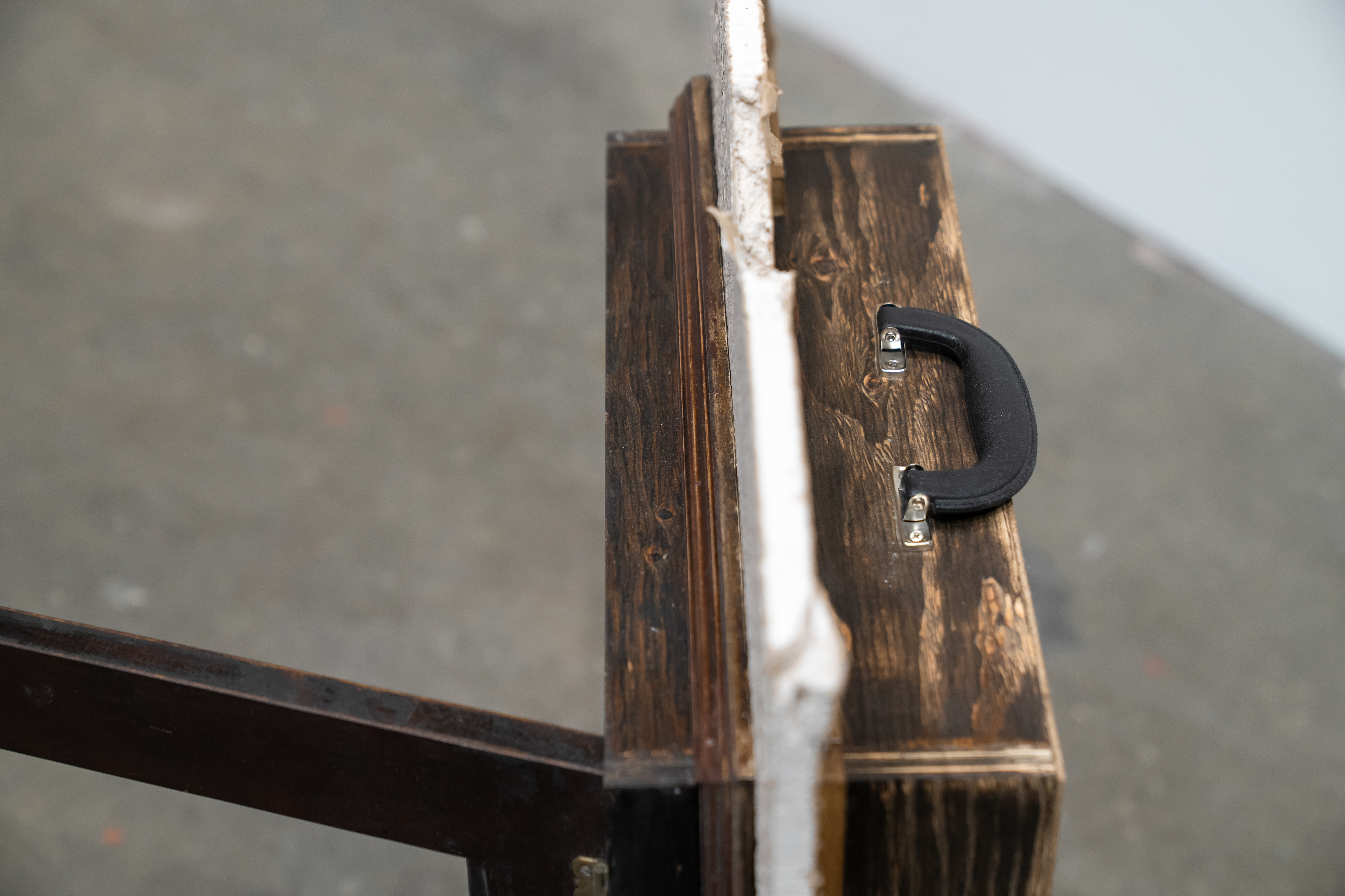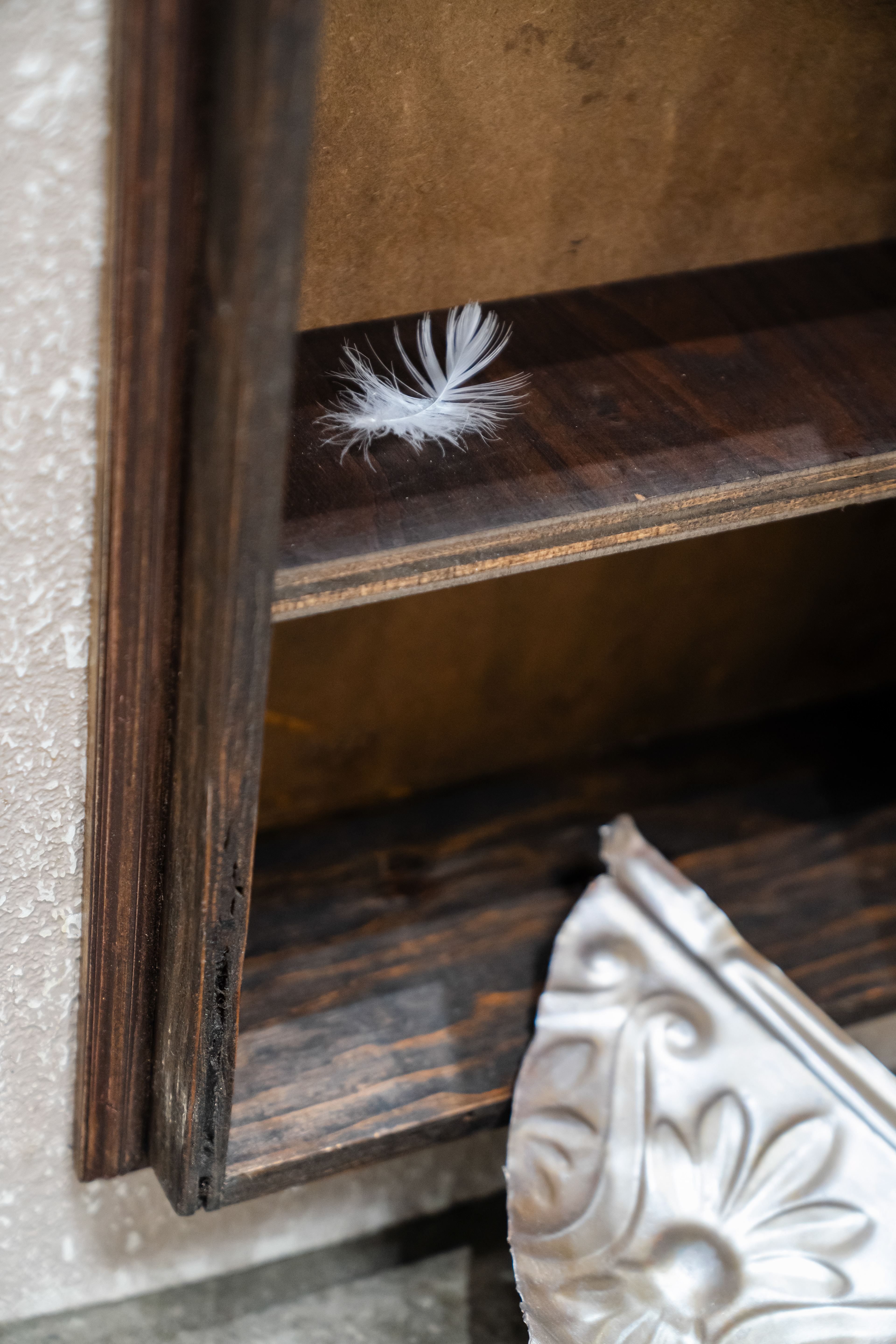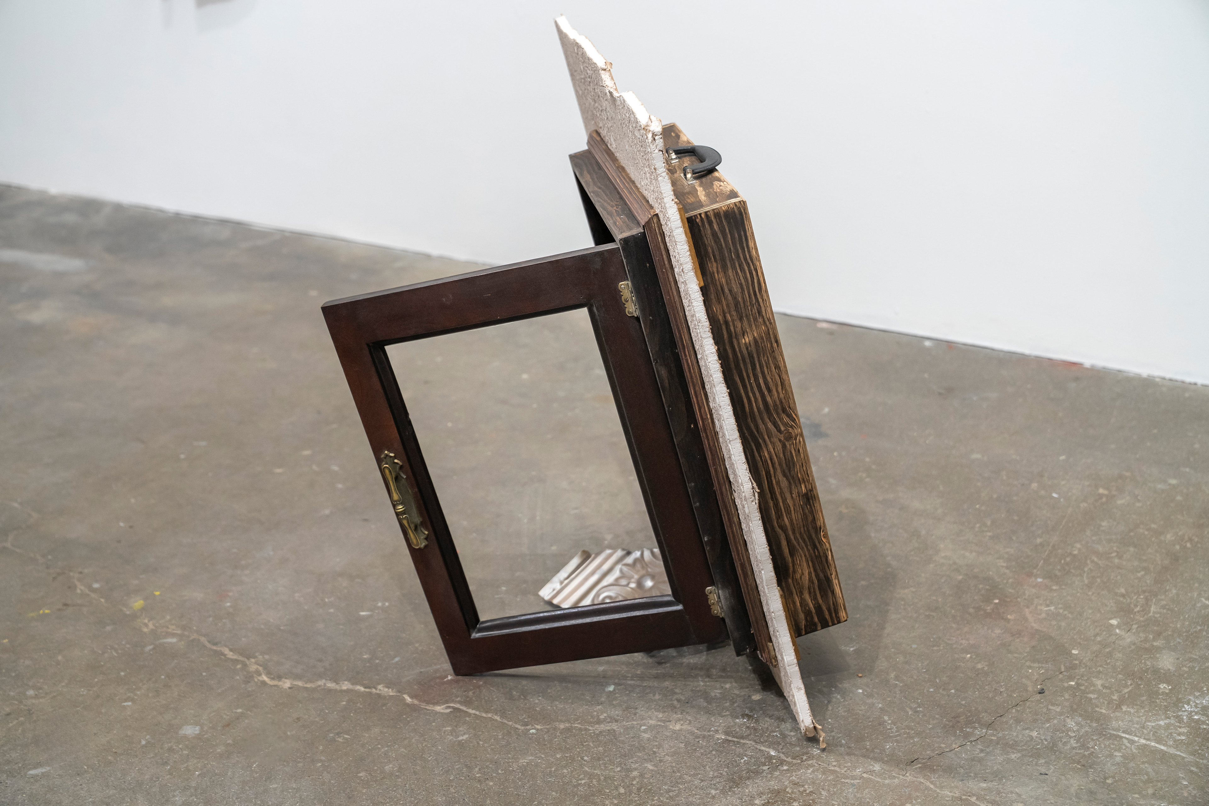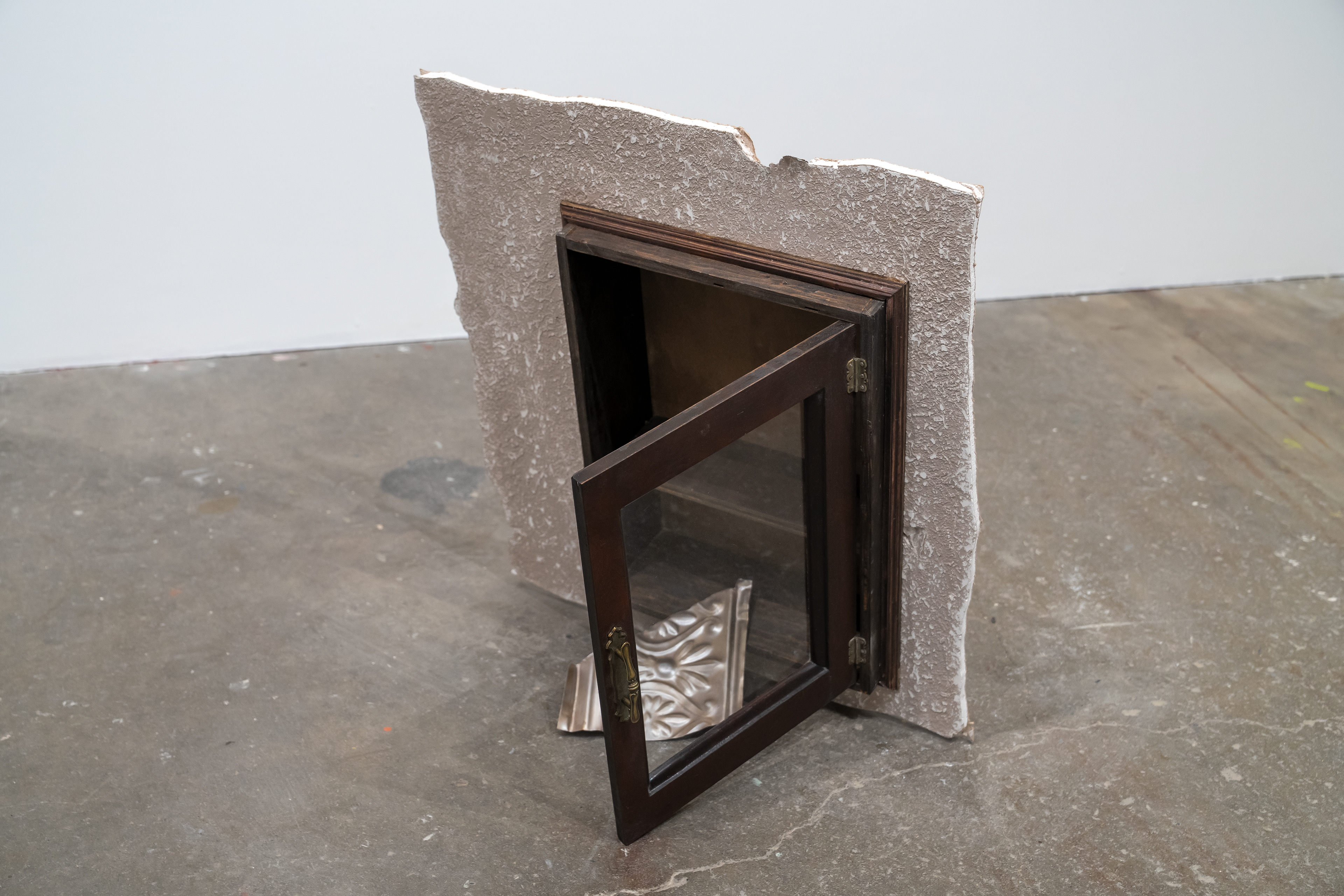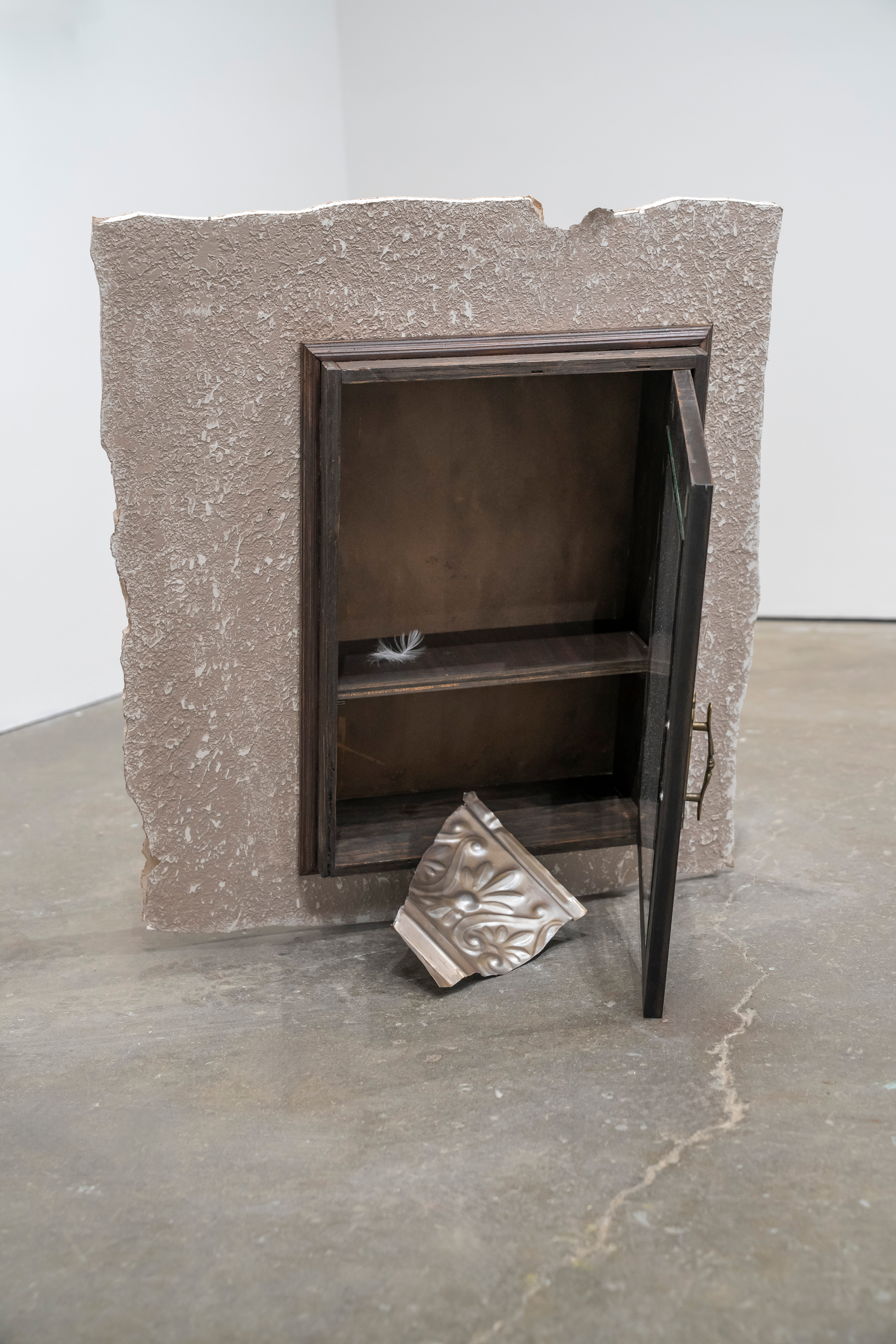 Drywall, wood, metal, cabinet, suitcase handle, feather 34" x 29" x 10" 2025