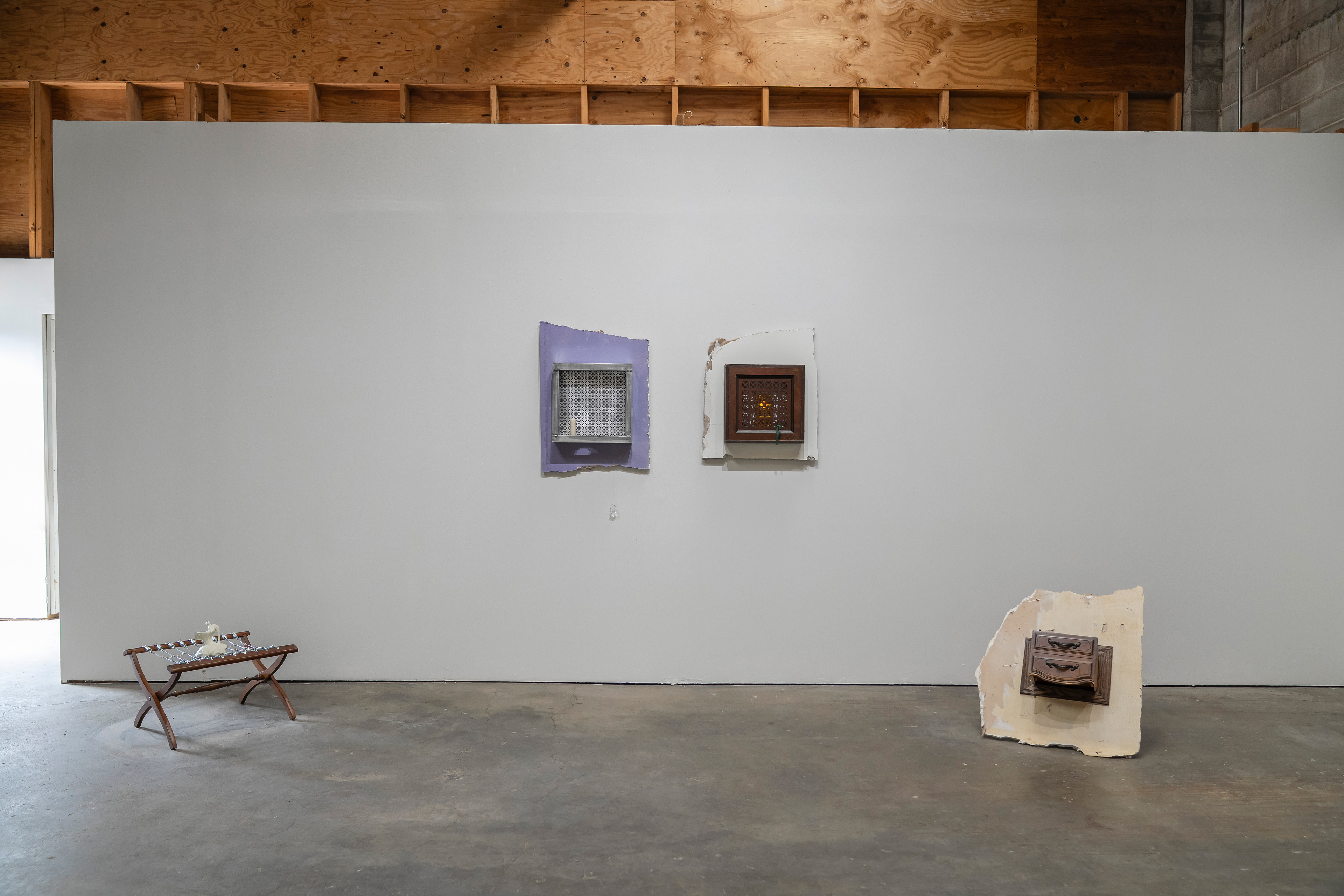 To take in Pouyanfar’s pieces, we need to physically reorient how we view what might otherwise be easily overlooked building surfaces. Moulding we might normally see at the edge of the ceiling above us is now on the floor; interior infrastructures have been opened up to be peered at from beneath and behind. These subtle shifts in viewership ask for consideration of the human body in relation to these materials: our own, implied past occupants of these buildings, workers who handled them, and the embodied refugee experience. Pouyanfar reemphasizes this in her recurring use of handles and knobs that imply the touch of a hand and compartments that suggest an interiority, both physical and emotive. Intimate details–a photograph veiled behind a translucent fabric, items hidden in a drawer, a partially melted candle–suggest elusive stories that dart away before we can fully hold them. They gesture to narratives not for us to resolve, but a sustained tension of life and longing we are invited to connect with.