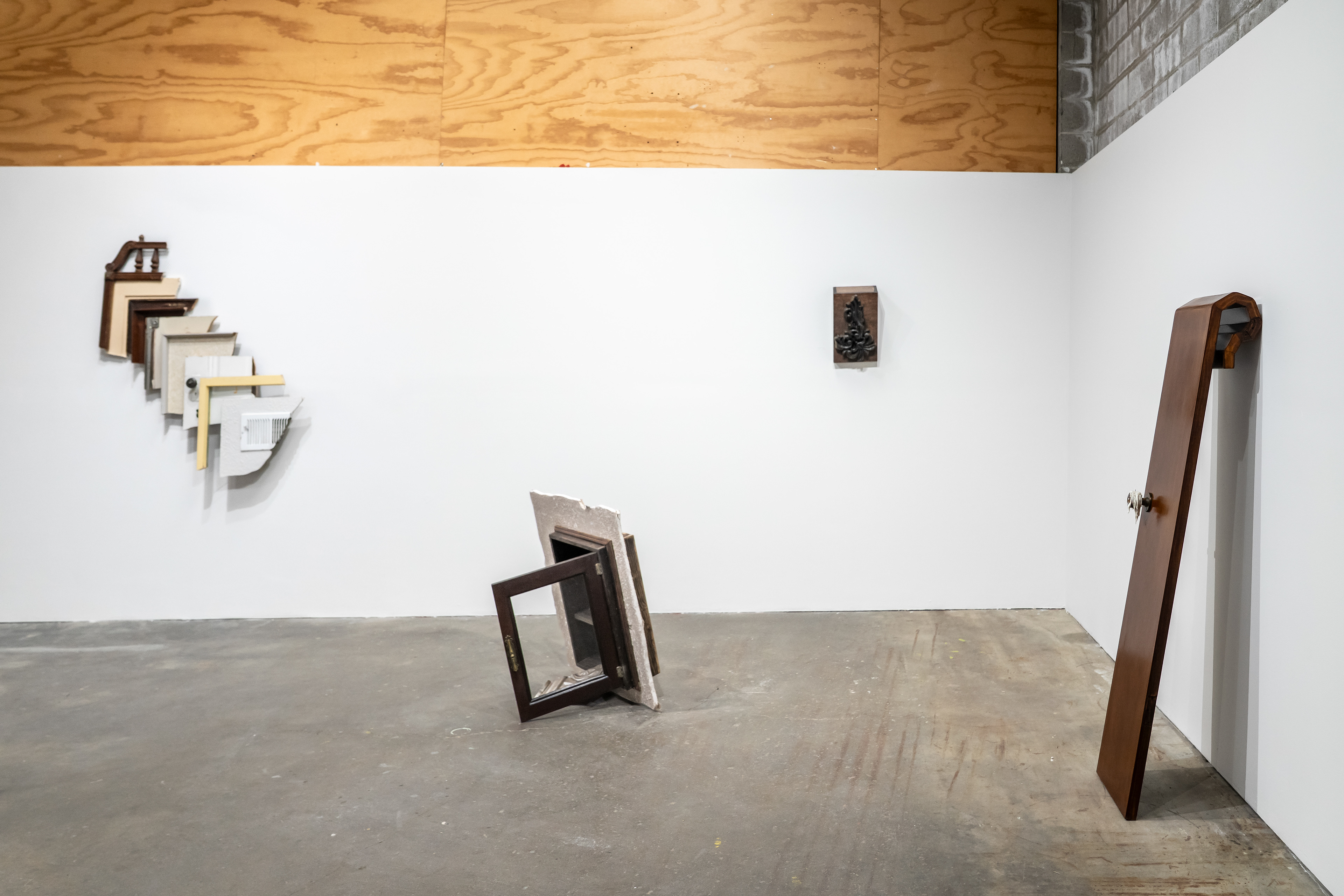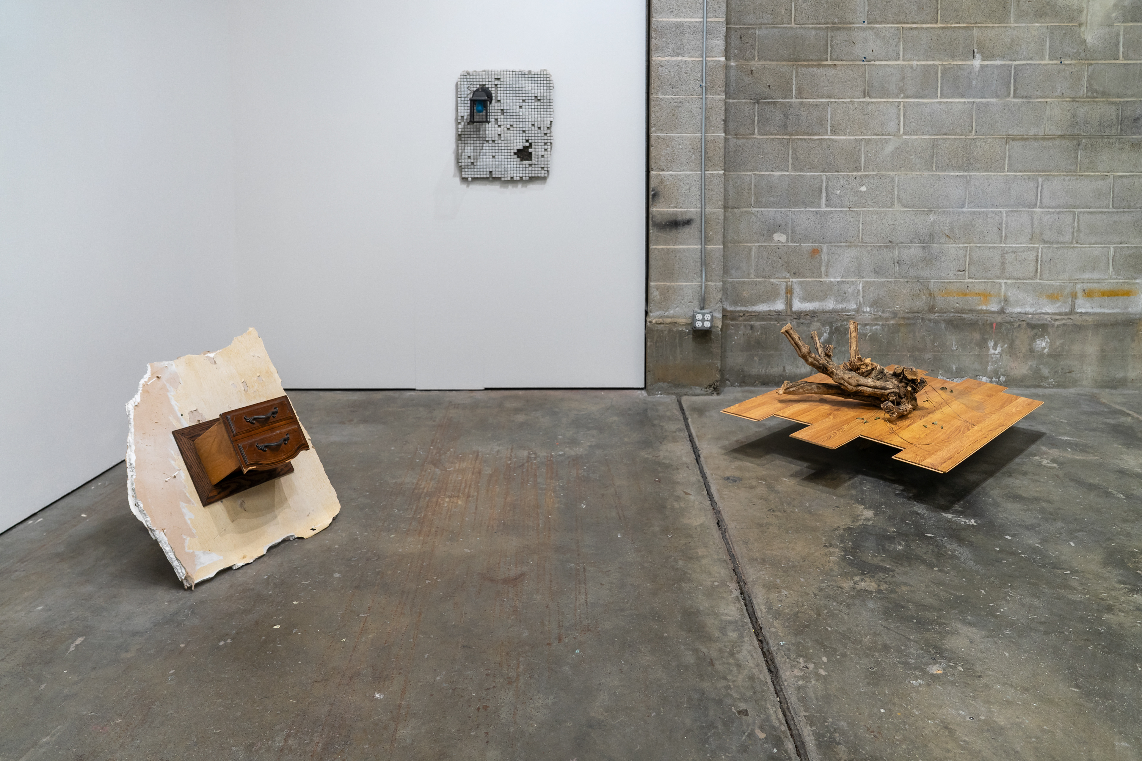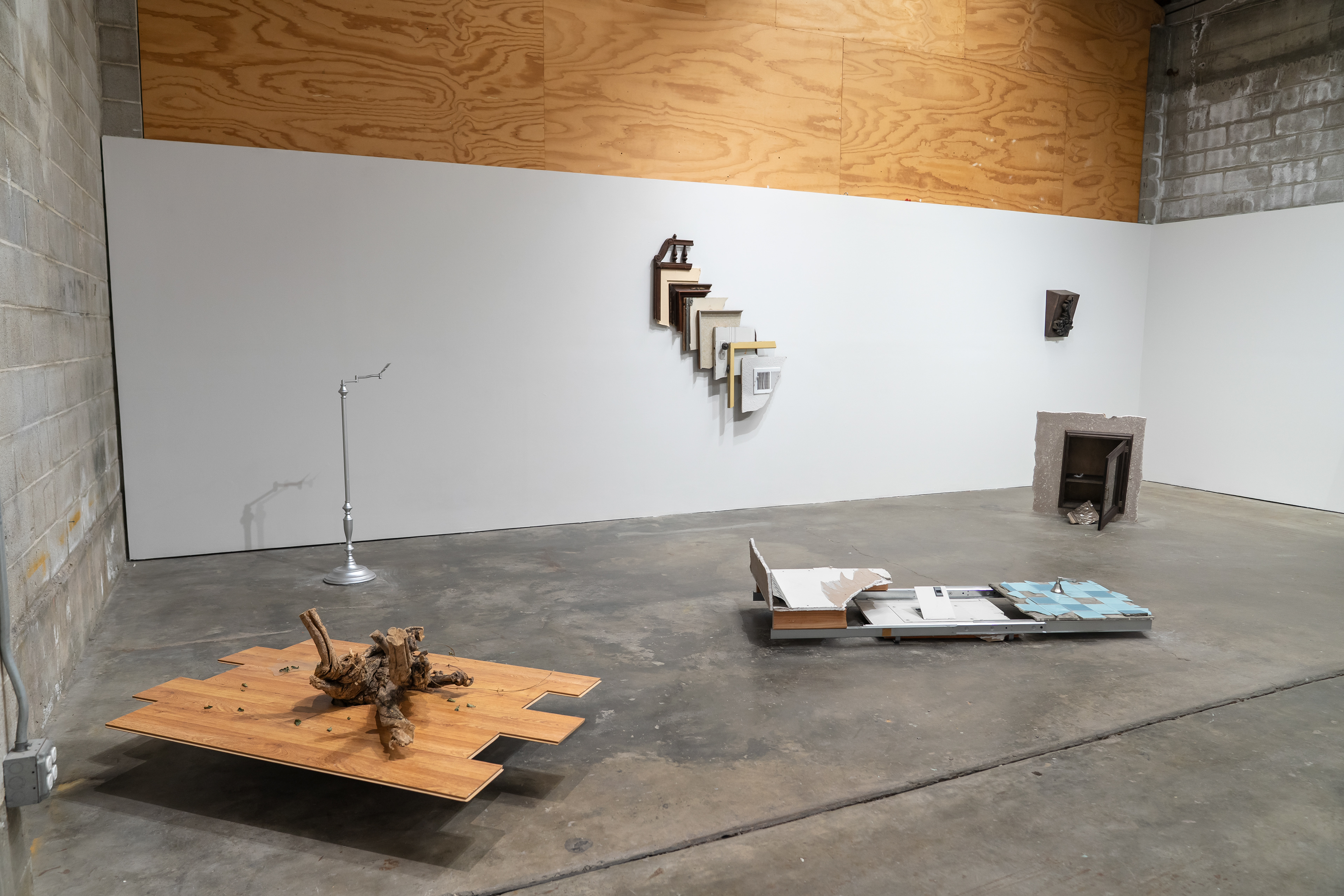 Helia Pouyanfar’s Addendum uses fragments of everyday domestic architecture and discarded construction debris as sculptural meditations on the complexities of the refugee experience. Her works embrace the poetic tension in using residential building materials, as a physical home is one of the belongings that cannot be uprooted to carry across borders. Through the embrace of these found objects, her artistic process becomes a means of understanding dislocation and survival.For refugees, the loss of home is irresolvable. Pouyanfar asks us to consider what might be generated in a new context and the process of becoming untethered from one’s homeland. Her work suggests something that isn’t necessarily liberatory, but what she describes as having a “perverse freedom” in its disorientation. The materials show wear and the wounds of demolition, but she brings them together with tenderness and craft. A truncated section of tree bursts from the perfectly sized gap in a section of wood floor planks. Sections of drywall are peeled and jagged, but carefully oriented. A neatly arranged spread of broken cabinetry, window frames, doors, and vents create a echoed refrain of corners.