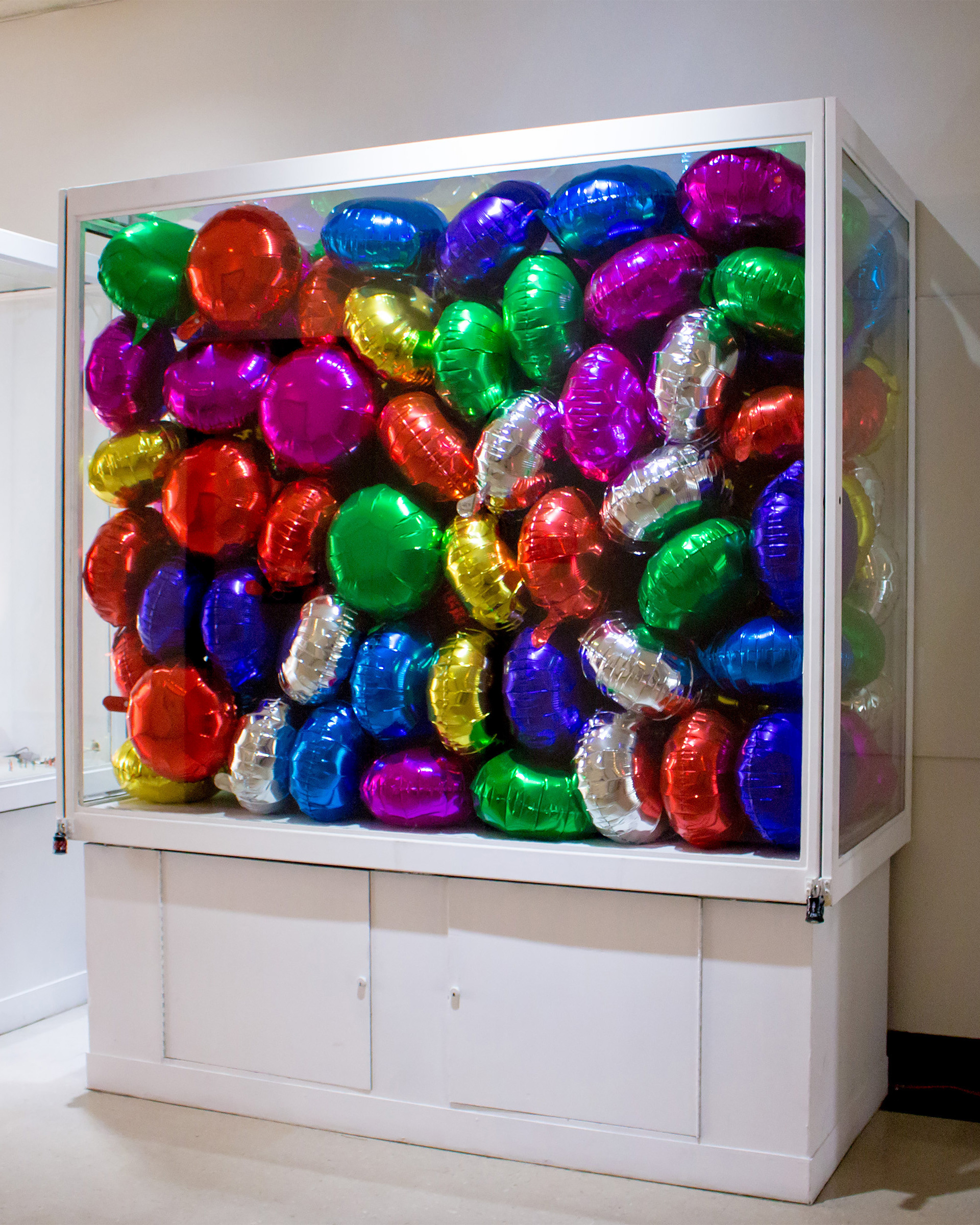 Gone talks about the confinement of play and its inaccessibility to its audience. The piece uses the space given as a frame and as a showcase to emphasize its existence. Like a storefront, its colorful glint overwhelms the earthy tones of the mundane university hallway. The piece speaks on the captivity of objects that are inherently free and highlights the potentiality of freedom within their confinement.