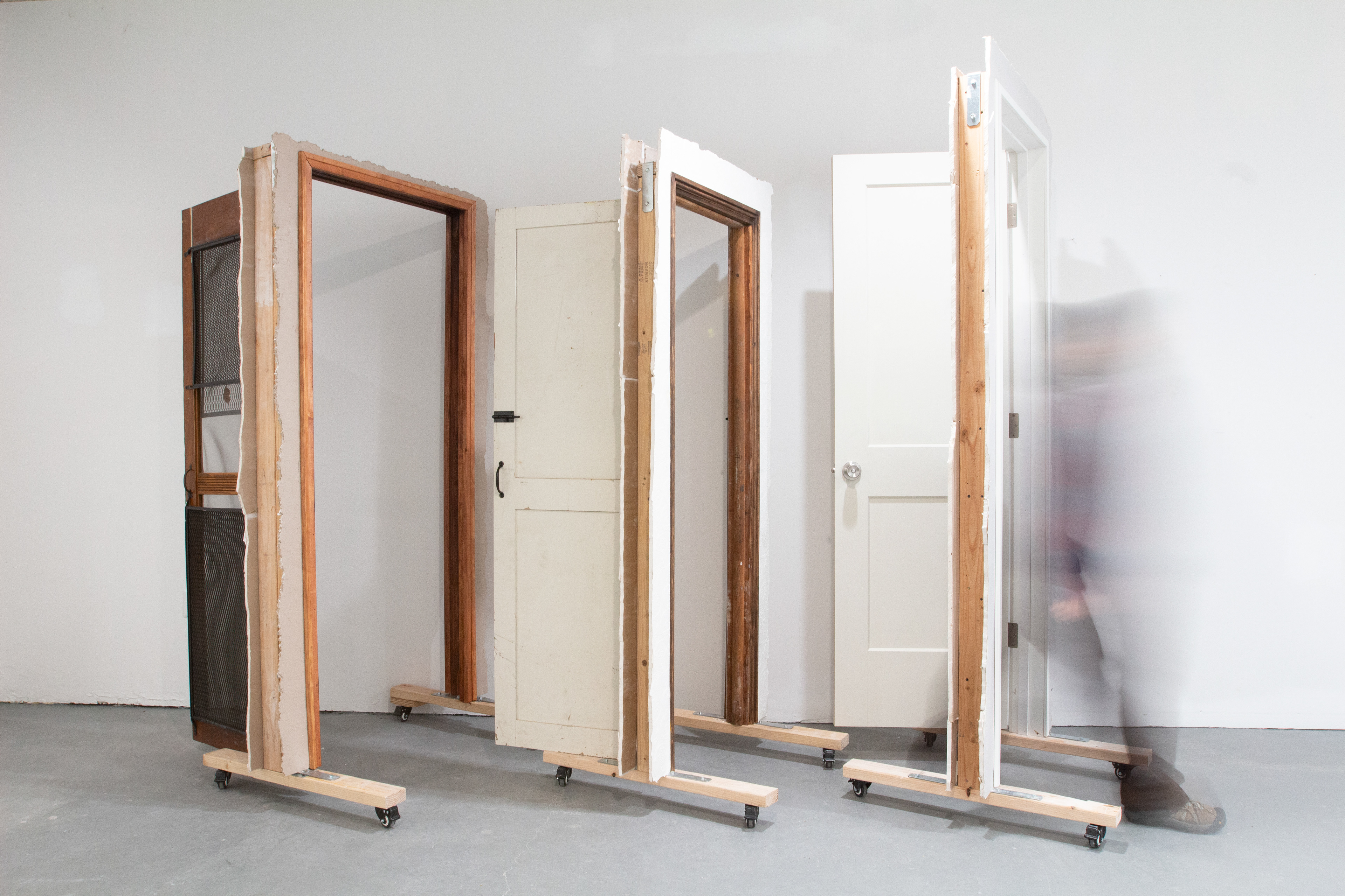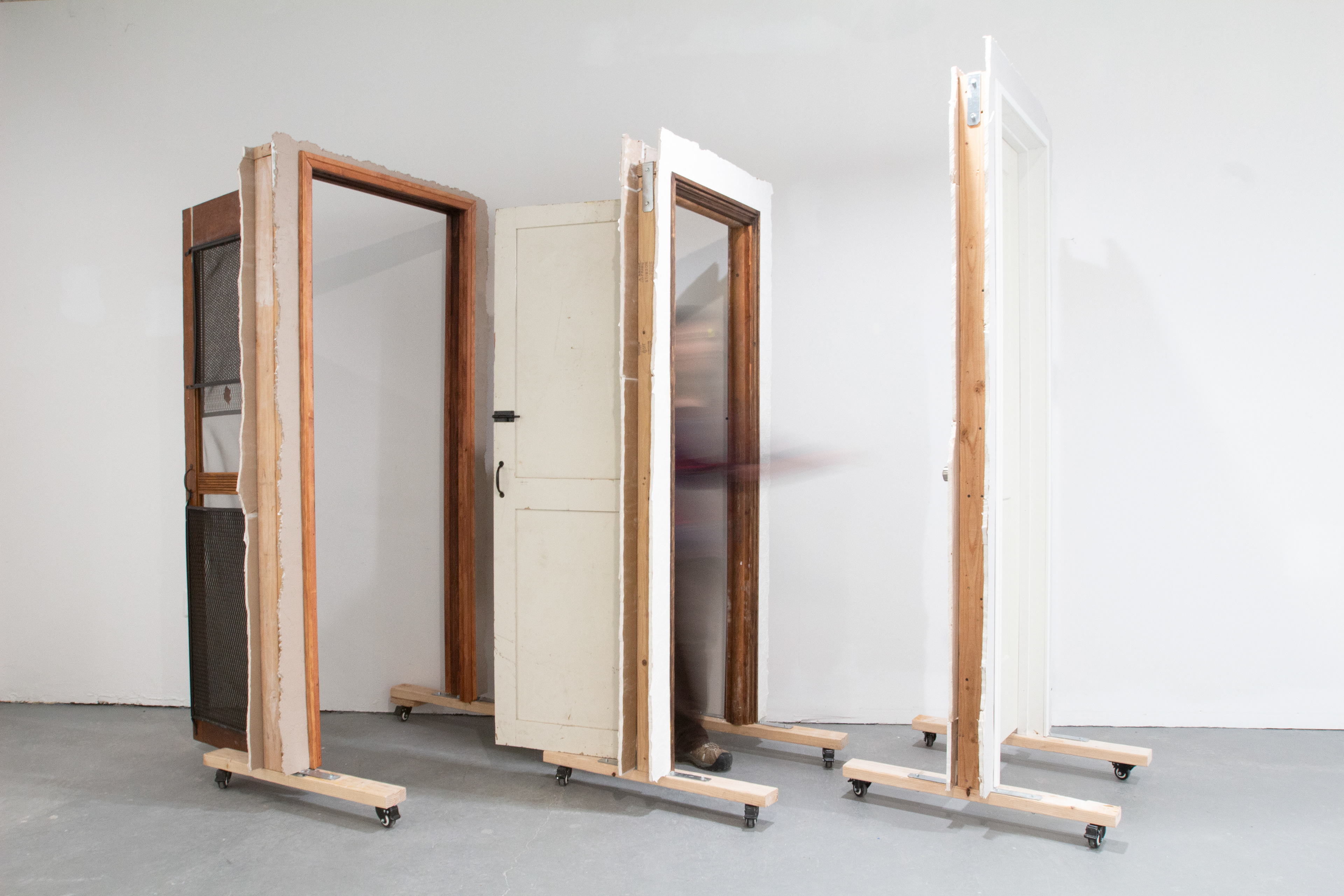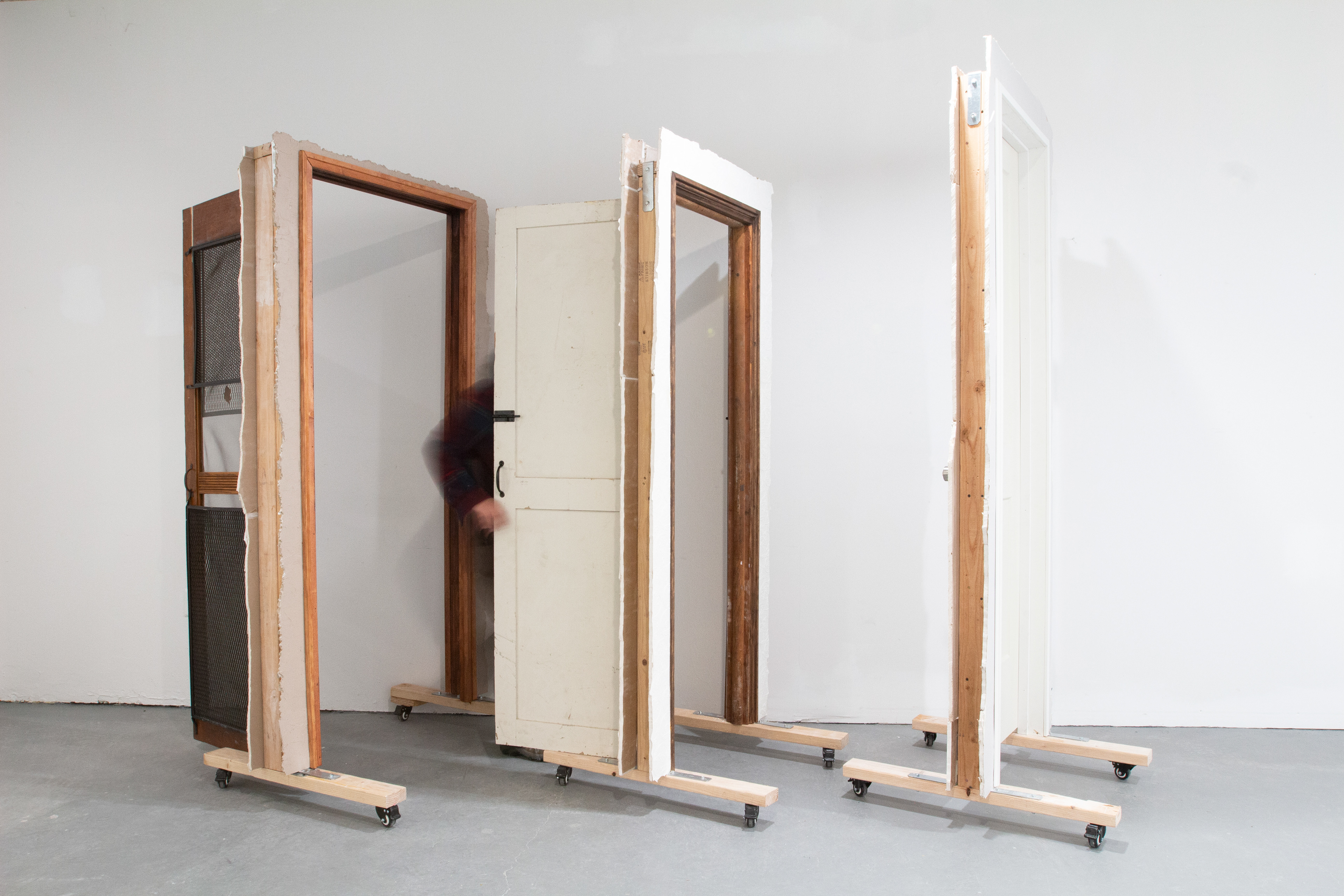 Found door, wallpaper, drywall, 2x4, wheels Varied dimensions 2021