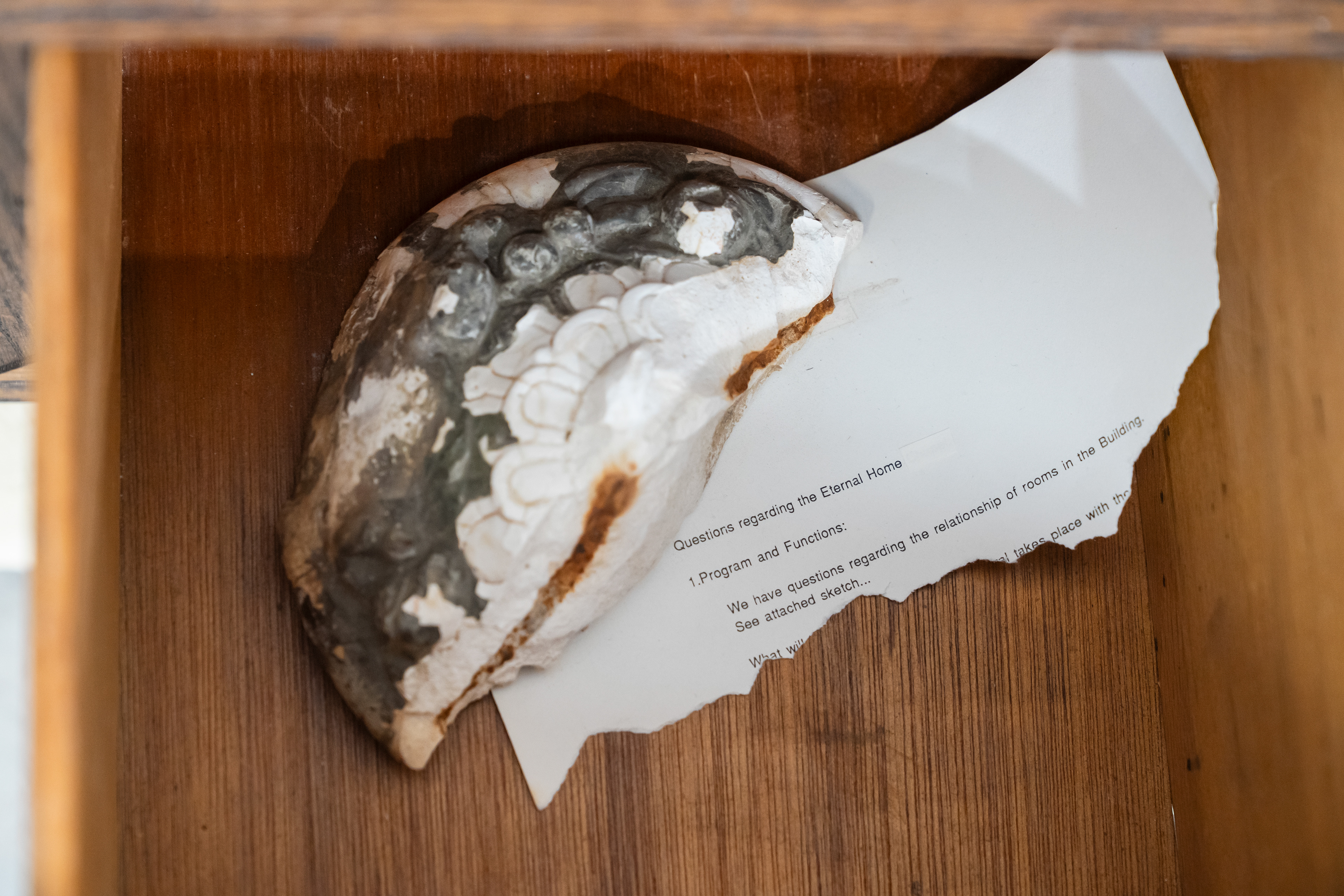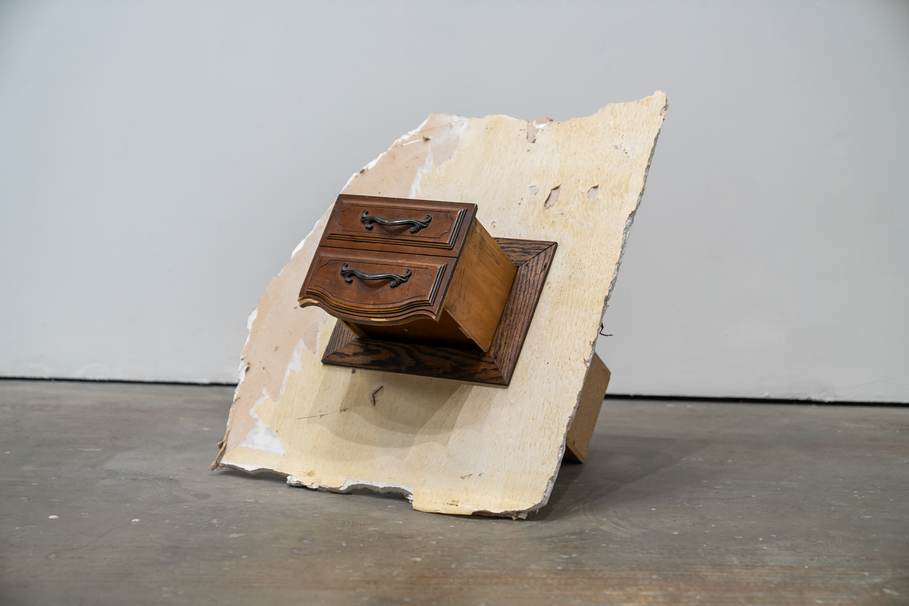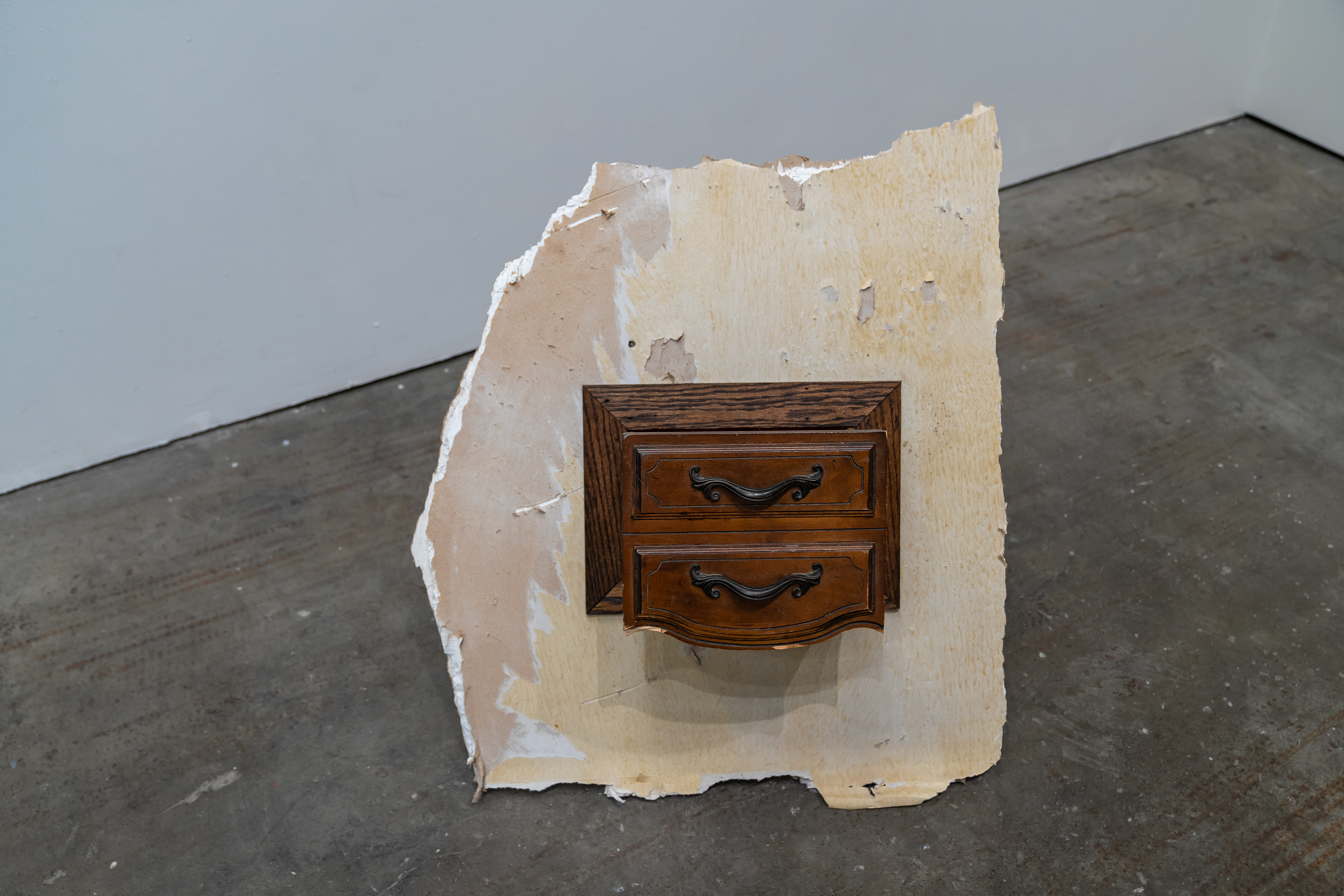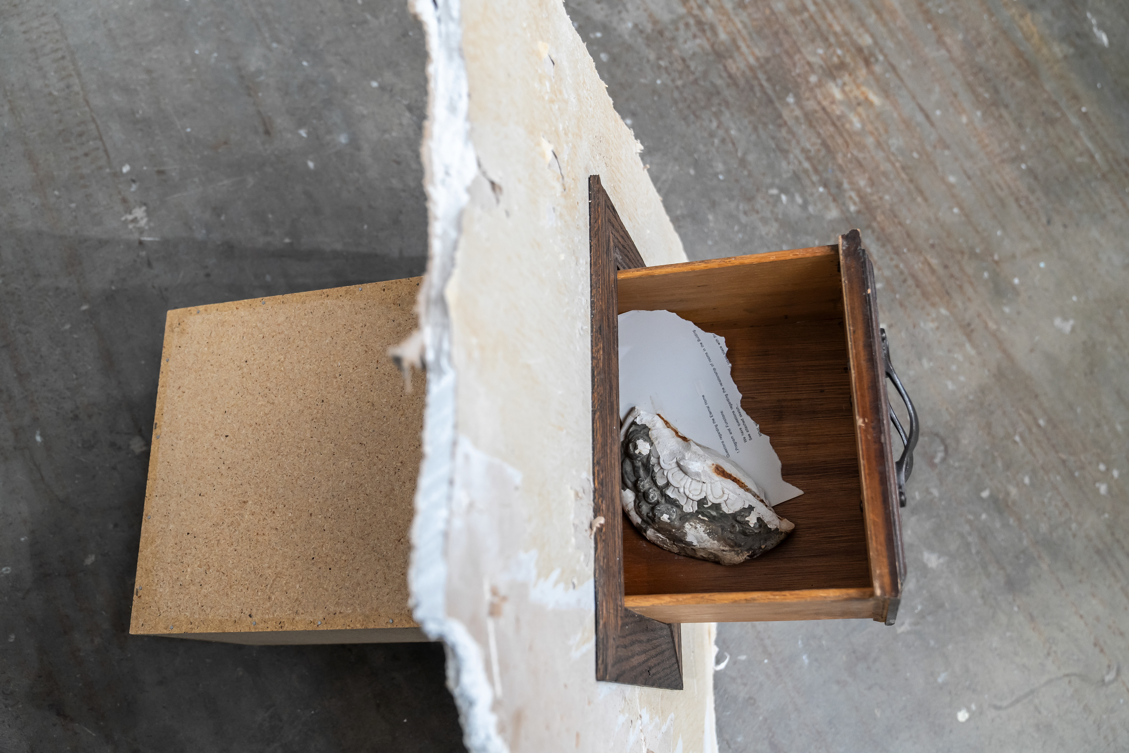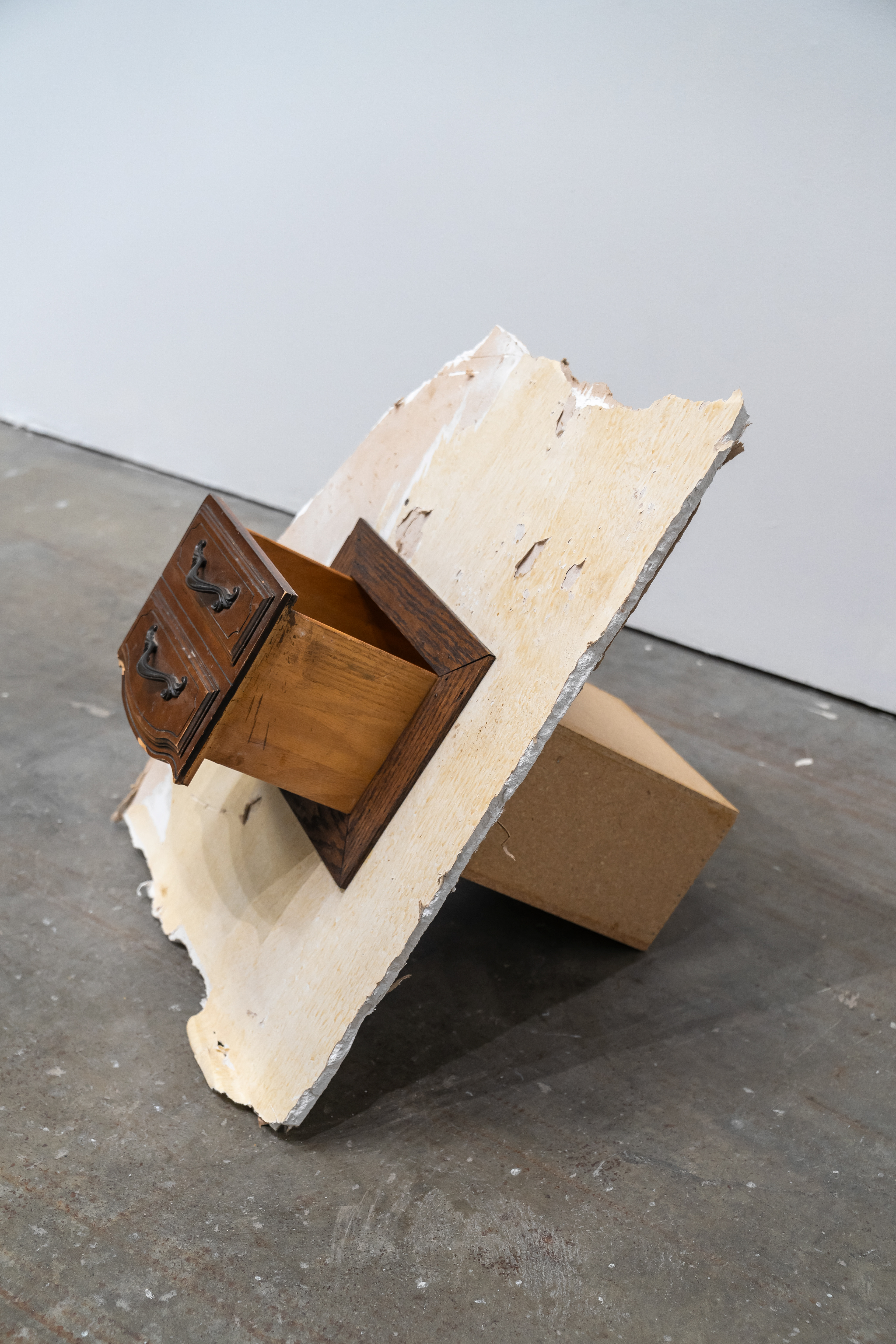 Wood, drywall, drawer, column fragment, text 26" x 28" x 25.5" 2025