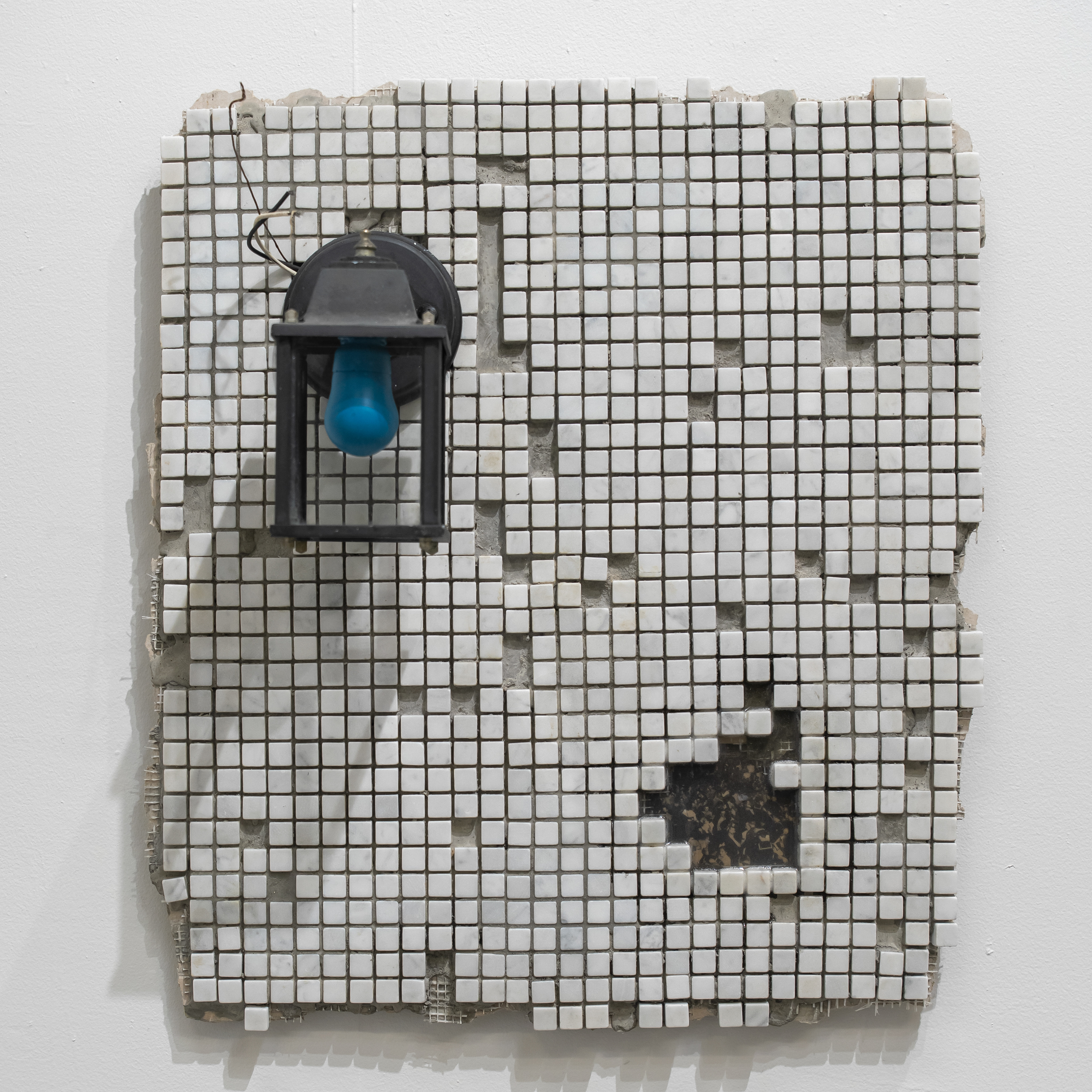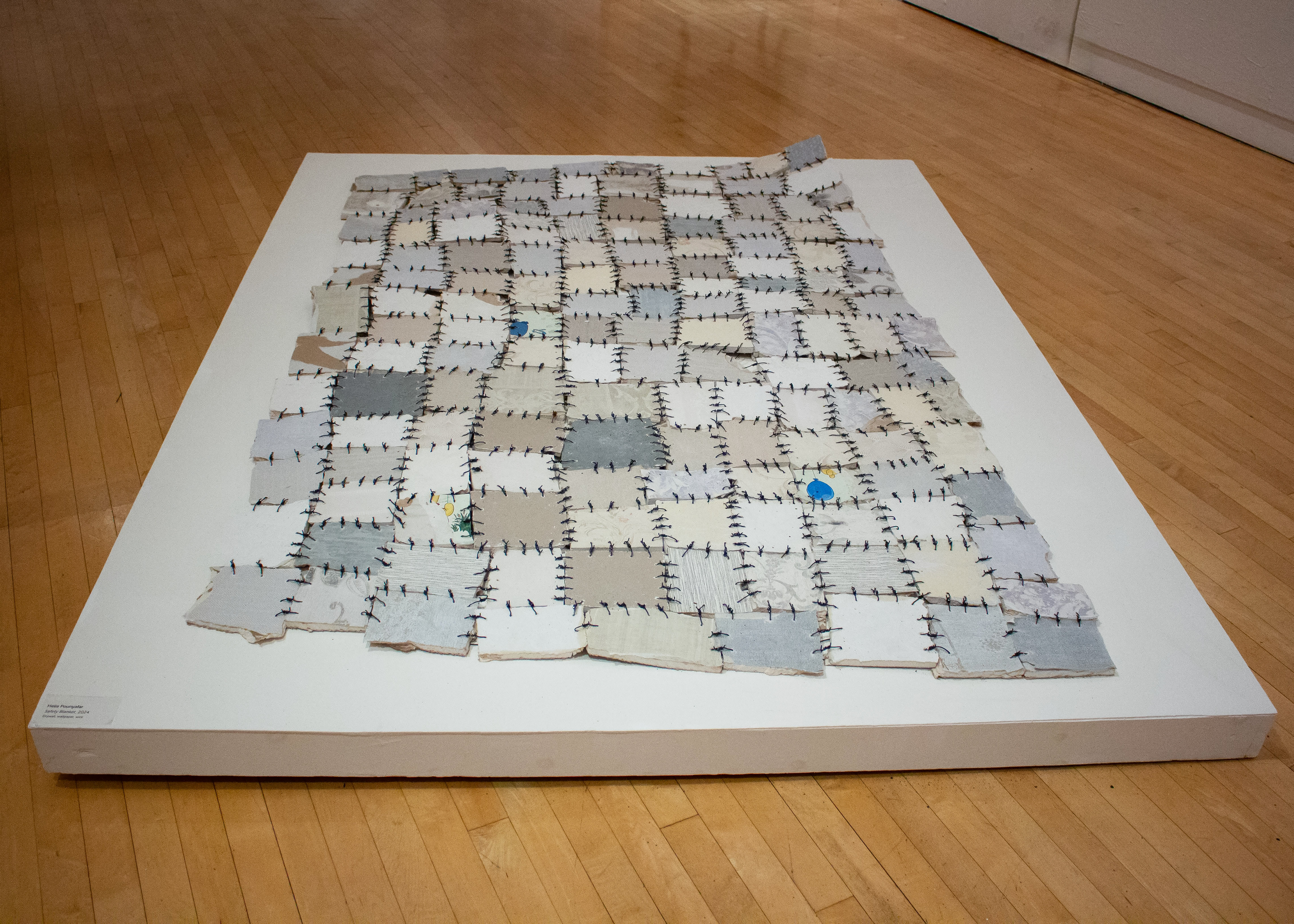 Safety Blanket consists of small pieces of drywall stitched together with wire to create a larger architectural tapestry. Reflecting on the violent language of border safety, Safety Blanket references imagery of barbed wire fences, land mapping, and demolition.